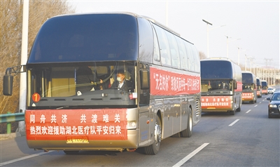 简短而热烈的欢迎仪式结束后,医疗护理队全体队员乘车前往集中休整点。在人们的欢呼声中,队员们不停地向车窗外挥手。