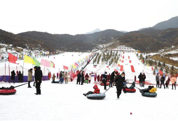 海东市民和回族土族自治县古鄯镇山庄村的七里花海滑雪场,洁白的冰雪世界里处处透露着七彩的欢乐。1月2日,七里花海景区入口大门,五颜六色的彩条、大红灯笼、粉红色的“樱花”,让严冬季节的花海洋溢着节日的喜庆气氛。玩雪圈、滑雪橇、体验雪地摩托……或单独享乐,或三两结伴,来到这里的人们在大山脚下的“冰雪世界”里体验着迎新年的乐趣。