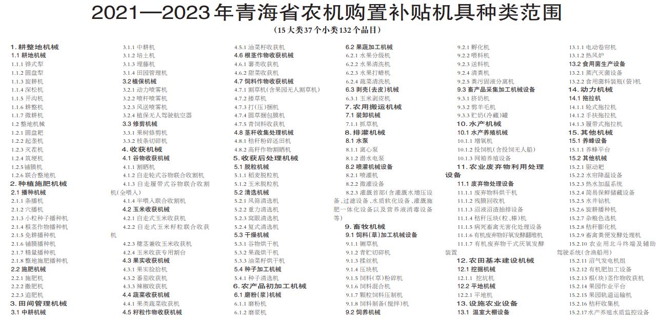 (一)补贴范围。中央财政资金全国农机购置补贴机具种类范围(以下简称“全国补贴范围”)为15大类44个小类172个品目,我省根据农业生产实际需要和资金供需实际,从全国补贴范围中选取15大类37个小类132个品目为我省补贴范围(见附件1),实行补贴范围内机具应补尽补。