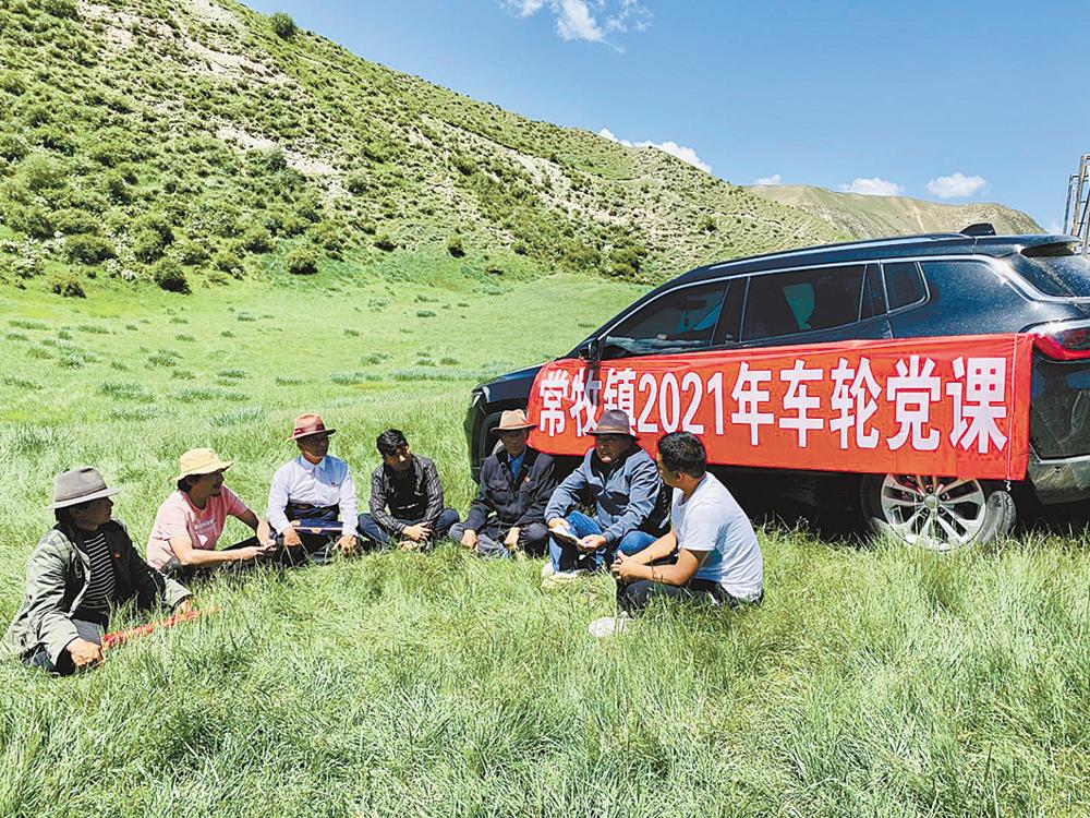 “为了让这几个牧业村的牧民党员听到政策、接受教育、提高党性,常牧镇出了新招,用‘车轮党课’探索出一条边远牧区开展党内组织生活的新路子。从今年6月份开始,工作组开始不定期地深入牧民居住点、夏季转场放牧点开展活动,真正使牧民党员在家门口及时‘充电加油’。”乔世林娓娓道来,讲述了开展“车轮党课”的缘由。