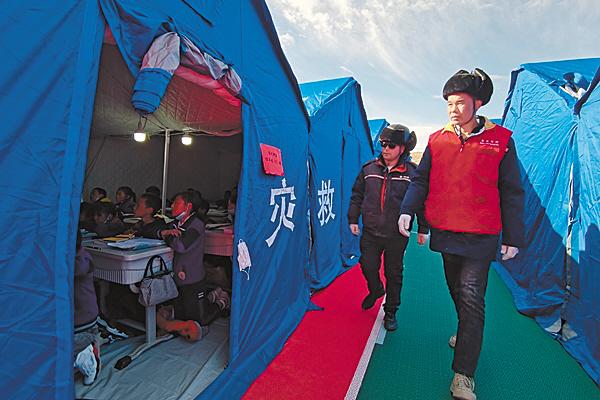 走进果洛藏族自治州玛多县嘎旦村临时安置点,一排排蓝色帐篷整齐排列,一面面鲜艳的党旗和国旗迎风招展,一户户群众的衣食住行安置妥当,整个安置点安静平和。