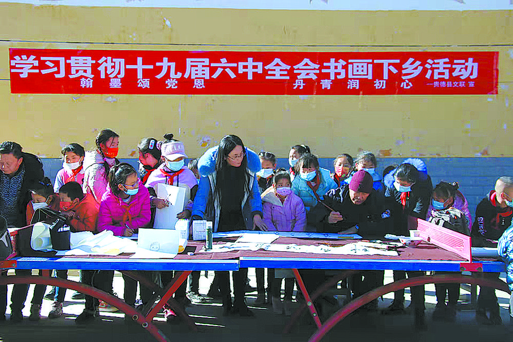 自党的十九届六中全会召开以来,海南藏族自治州贵德县文联第一时间组织人员开展一系列主题文艺活动,创作出一批彰显党的百年奋斗重大成就和历史经验、弘扬伟大建党精神的文艺精品,引导广大党员、群众形成思想共识。12月14日,文联组织书画家,深入河阴镇歇春园社区、河东乡王屯小学开展文艺下乡活动。(栾雨嘉 童世钰 马永芳 摄)