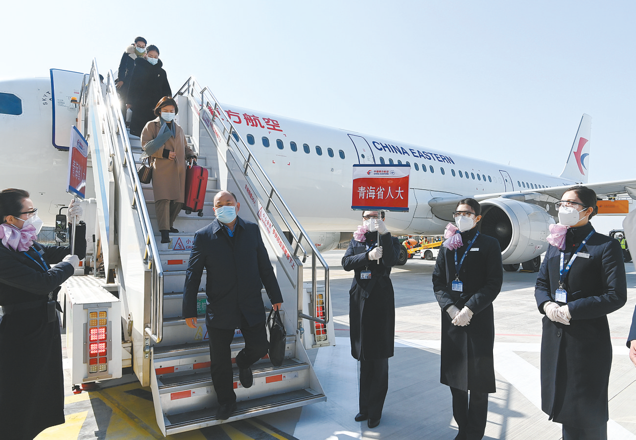 3月3日上午,出席十三届全国人大五次会议的青海代表团抵达北京。摄影:张地委