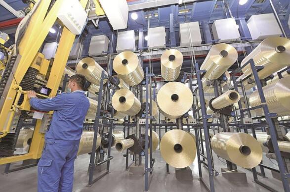 中复神鹰碳纤维西宁有限公司生产车间内,技术人员正在开展退丝架作业。祁晓军 摄