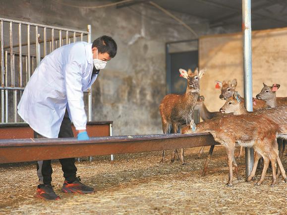 村民马国昌天不亮就起床了,他每天的心思都在梅花鹿养殖基地里。这不,自己还没顾上吃口饭,就急匆匆出门去给他的“宝贝”梅花鹿准备早餐了。刚一打开圈门,一群梅花鹿就闻声而来,像见了亲人一样围在马国昌身边,圆圆的大眼睛里满是对他的盼望和依恋。马国昌也亲昵地跟“孩子们”打着招呼,然后利索地将料槽收拾干净,再把他提前准备好的玉米面饲料缓缓倒入料槽、撒匀,并招呼“孩子们”开饭了。梅花鹿们蹦跳而来,围着料槽大口大口地吃起来。马国昌走到两头小梅花鹿身边蹲下身来,用手摸了摸它们的头,细致地观察着它们吃食的状态,又蹲下看起了地上鹿的粪便,一系列观察结束后,他脸上的愁云消散了。