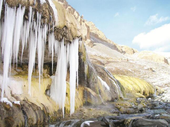 岗什卡雪峰是祁连山脉东段的最高峰,在岗什卡雪峰,山头冰塔林立、冰雪常年不化,而山脚下是众多山泉喷涌汇聚而成的彩色瀑布,让游客和摄影爱好者感受着青海冬日里的缤纷色彩。