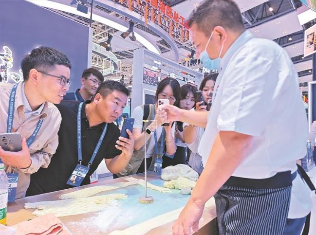 最热闹的当数拉面技艺展示。全国劳动模范、青海拉面匠人韩玉龙的案板前已围得水泄不通。只见他抓起面团,在手中飞速揉搓、拉抻,面条从粗变细,最后竟细如发丝。当他拿起一根针,将十余根面条顺利穿入针孔时,人群中瞬间爆发出雷鸣般的掌声。“太神奇了!”一位学生举着手机录完视频,兴奋地说,“一定要去青海吃正宗的牛肉拉面!”韩玉龙擦了擦手,递上这次带来的牛肉面产品,笑着说:“现在我们已经研发了新产品,如果大家想品尝现做的手艺,可以到线下店里——毕竟我们青海的拉面已经开遍全国,还走进了二十多个国家。”
