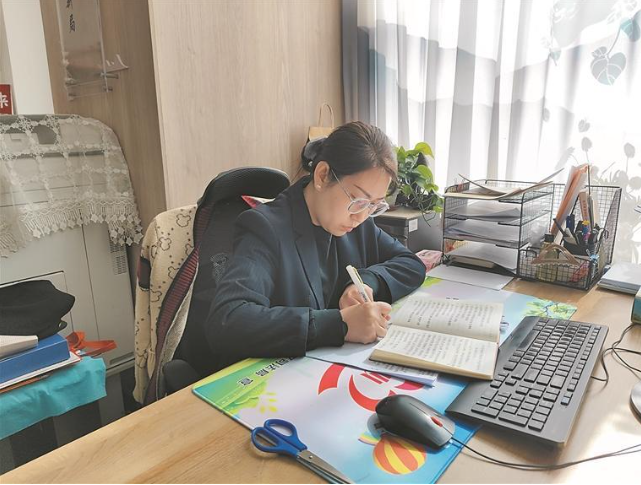 马兰在准备向社区居民宣传国庆中秋假期安全提示等内容。记者 丁玉梅 摄