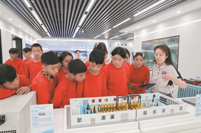 9月28日,玛多县学生在国网北京电科院国网级实验室参观通州牛堡屯充电设施自动检验检测流水线模型。国网果洛供电公司供图