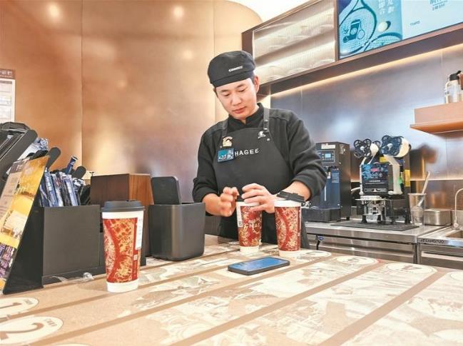 只见沙海邦熟练地将刚刚制作完成的茶饮摆在取餐口。作为一名制茶师,这个年轻人不仅制作速度快,而且水准很高,一点不输其他员工。