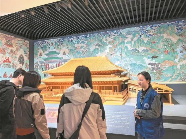 为了更好地完成自己的目标,在拿到讲解词后,范芠鑫迫不及待地练习起来。担任暑期讲解员后,她又针对游客感兴趣的内容不断丰富自己的解说。比如在讲到舞蹈纹彩陶盆时,她会补充介绍这件文物的原件藏于国家博物馆;在介绍永乐款铜鎏金观音立像时,她会指着展厅一旁瞿昙寺隆国殿等比例微缩的木质模型介绍瞿昙寺……