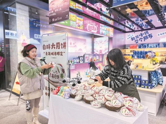 无独有偶。在省博南门的文创店,同样热爱家乡的青海山宗水源文化创意有限责任公司副总经理刘盈正在通过直播平台介绍公司在国庆中秋假期推出的新产品——青海月饼。
