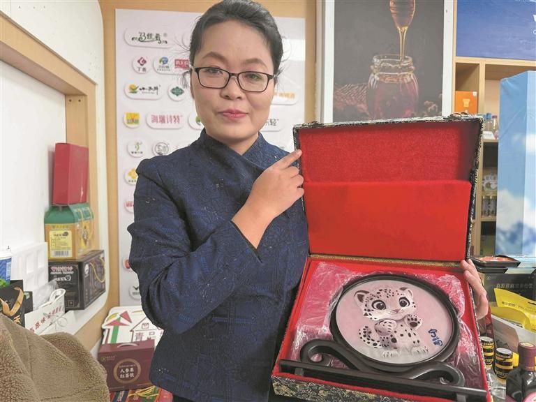 直播现场,青海省非物质文化遗产代表性项目(河湟刺绣)传承人陈玉秀展示刺绣作品。