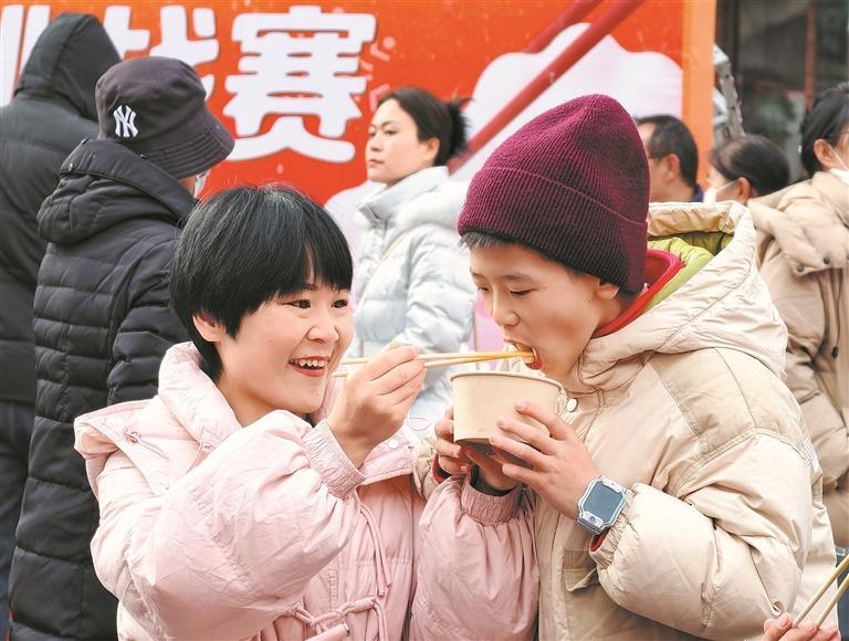 不远处,吃辣挑战的嘶哈吸气、跳远落地的喝彩,混成一片生机勃勃的交响。范玉梅喝完最后一口汤,脸颊红扑扑的。她望向这歌舞、香味与笑脸交织的街道,碗中余温,仿佛已弥漫成整条街的底色。