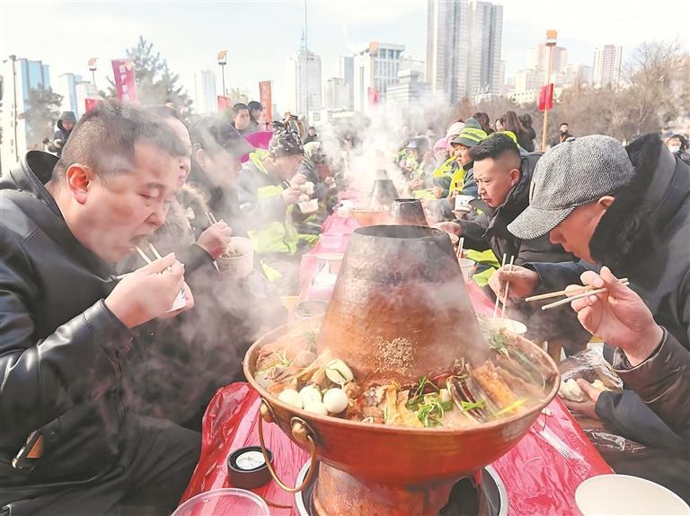 暖流在城市中心同样汩汩涌动。中心广场百姓大舞台前,长桌一字排开,简单却隆重。刚出锅的饺子、热气腾腾的暖锅,氤氲的白雾模糊了彼此的身份标签——环卫工人灰绿相间的工服、保安藏青色的制服、辖区居民的日常着装,此刻都围坐在一起。