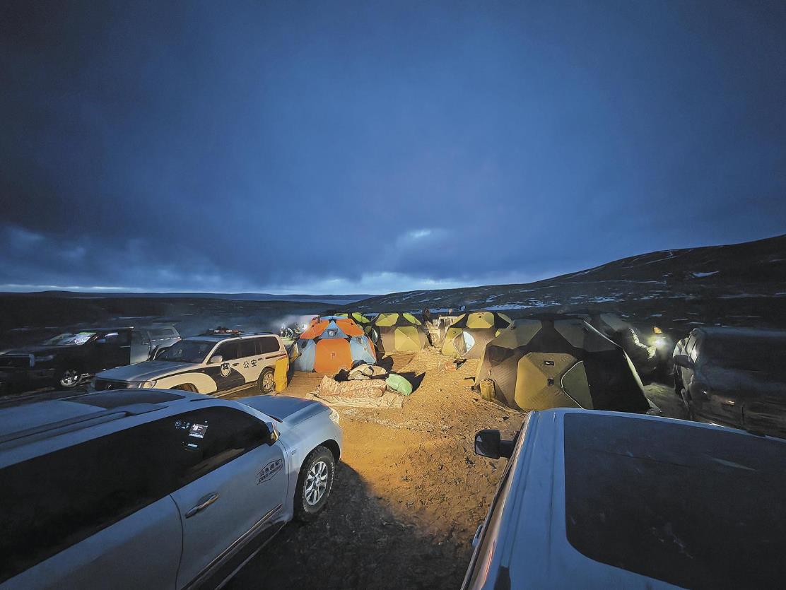 山下是一汪小湖,远处能望见布喀达坂峰。看着不远,却走了一整个下午。直到晚上7点,我们才再次抵达太阳湖畔,在一处避风的山崖下短暂休整。巡山队员各司其职:有的重新绑紧物资,有的给车辆加油,有的分发补给。一整天没停车吃饭,只是在车里啃了几块煮好的牛肉,干嚼了一包方便面——硬邦邦的面饼在嘴里嘎嘣作响。