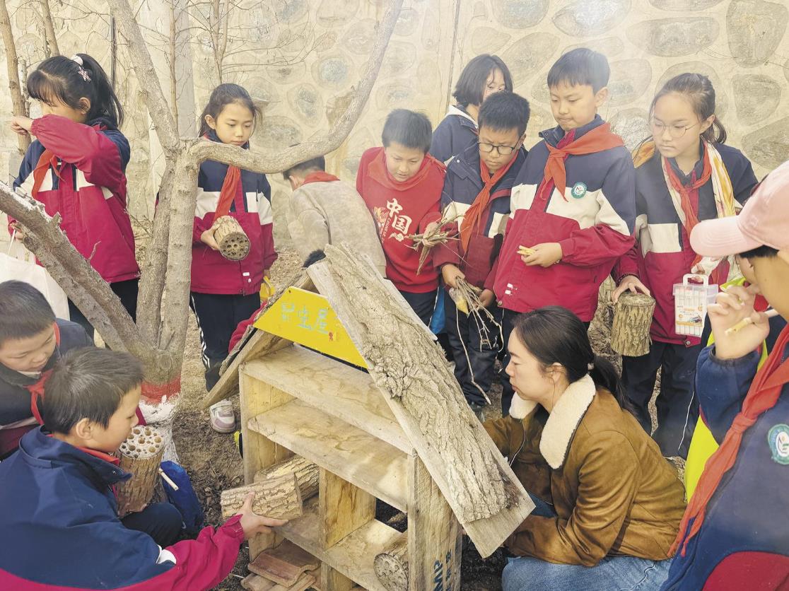在西宁市光华小学,四年级的孩子用树枝、芦苇秆、瓦片等材料,搭建起一座座精巧的昆虫屋。在生态微景观打造中,他们将移栽来的香蒲、芦苇细心栽种到校园内,期待春暖花开时,这些来自湿地的“小客人”扎根生长。