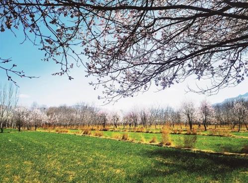 4月初,化隆县群科镇安达其哈村冬麦返青、杏花盛开,秀美的风景吸引游客慕名而来。赵俊杰 摄